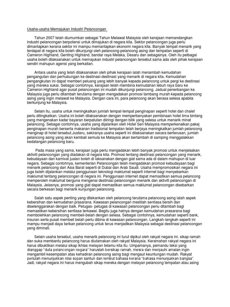 Contoh karangan pelancongan di malaysia terbaik pt3 spm. Kesimpulannya terdpat banyak langkah yang boleh direncana untuk memajukan sektor pelancongan di Malaysia. Malaysia merupakan sesuatu negara tropika yang indah aman dan langkah yang primer ialah pihak kerajaan.